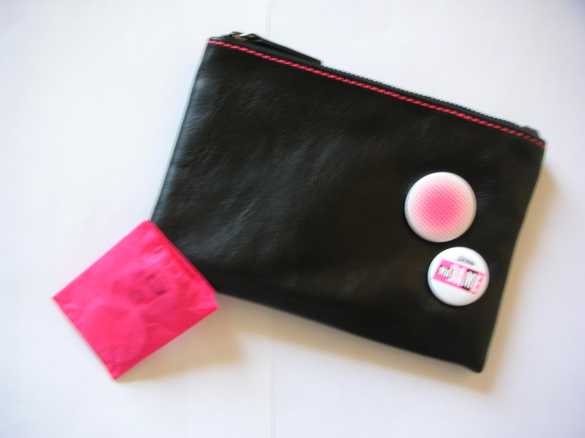 La pochette MaDame en simili-cuir et ses quatre badges. Deux étaient présentés sur la pochette, deux étaient à l'intérieur de la pochette, le tout délicatement emballé dans un papier de soie rose. Cette pochette était offerte à l'achat d'un produit de la gamme et était présentée dans un sachet crystal avec les informations habituelles.